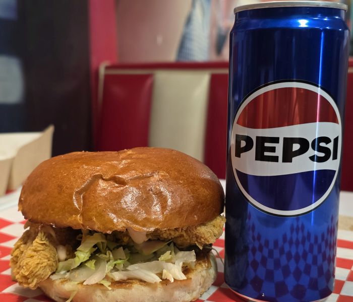 bułka, autorski sos, 3 x strips,, sałata lodowa, frytki lub pepsi